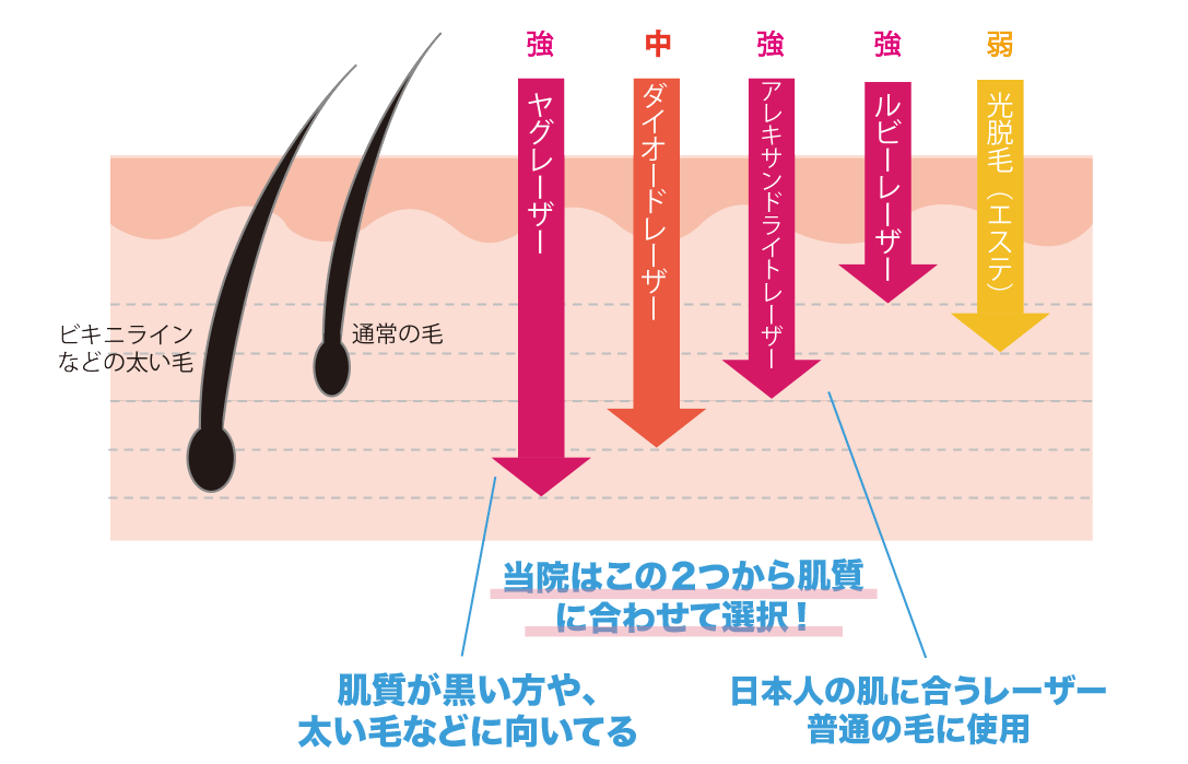 医療脱毛が身近になった昨今、様々な医療脱毛機が登場しています。当院では、患者様に安心していただけるよう厚生労働省認可の医療脱毛機を採用、『質の高い脱毛』を患者様に提供できるよう高品質の機械にこだわりを持っています。もちろん施術の途中で機械を変更することはありません。